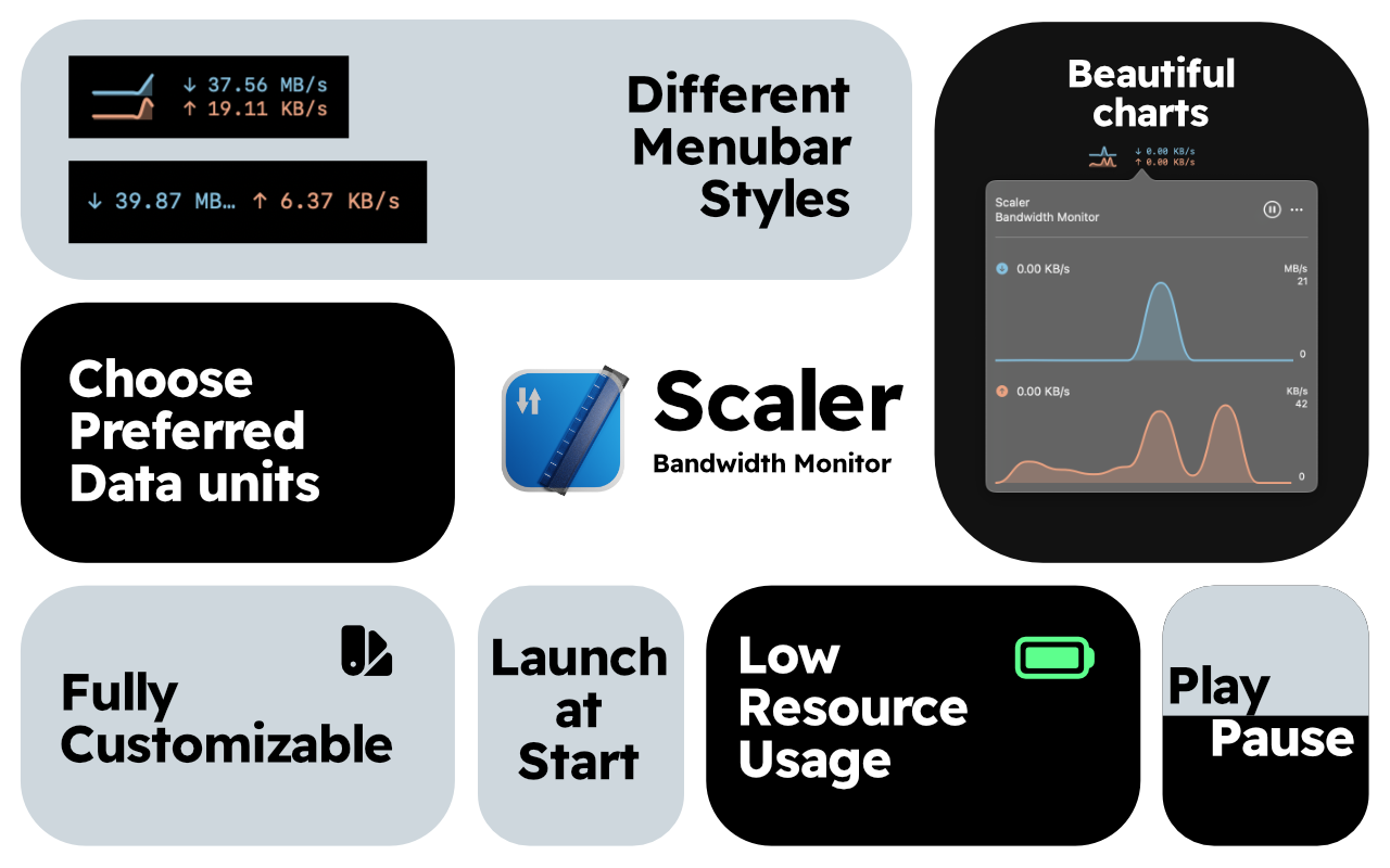 I used MenuMeters for many years (with only up/down speeds showing). Moving to a new M1 Mac I didn't want to install Rosetta just for this feature. Scaler Bandwidth Monitor does exactly what I want and does it beautifully. Minimal design and a modern app. Fantastic. I give it 5-Stars because it is pretty much perfect ...